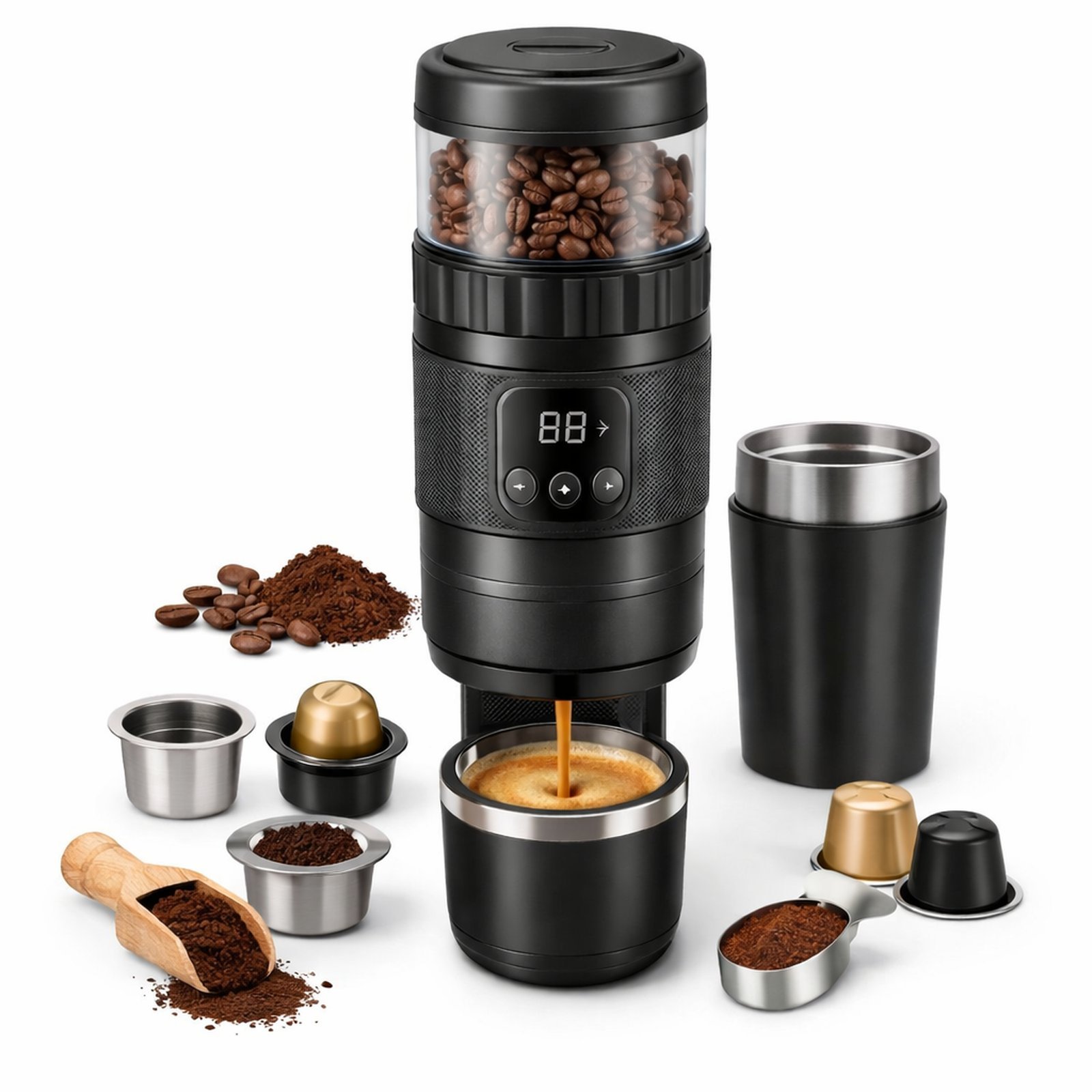 Enjoy barista-style coffee anywhere with this 3-in-1 portable electric coffee grinder and espresso maker. Designed for travel, home, and office use, this compact machine allows you to grind fresh coffee beans, brew espresso, or use coffee capsules in one convenient device. The USB rechargeable design makes it cordless and easy to carry, while the powerful brewing system delivers rich flavor and smooth crema every time. Perfect for coffee lovers who want fresh coffee on the go without bulky equipment.