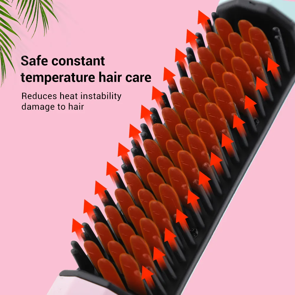 Portable rechargeable hair straightening comb with dual straightener and curler function. USB charging and cordless design perfect for travel and quick hair styling.
